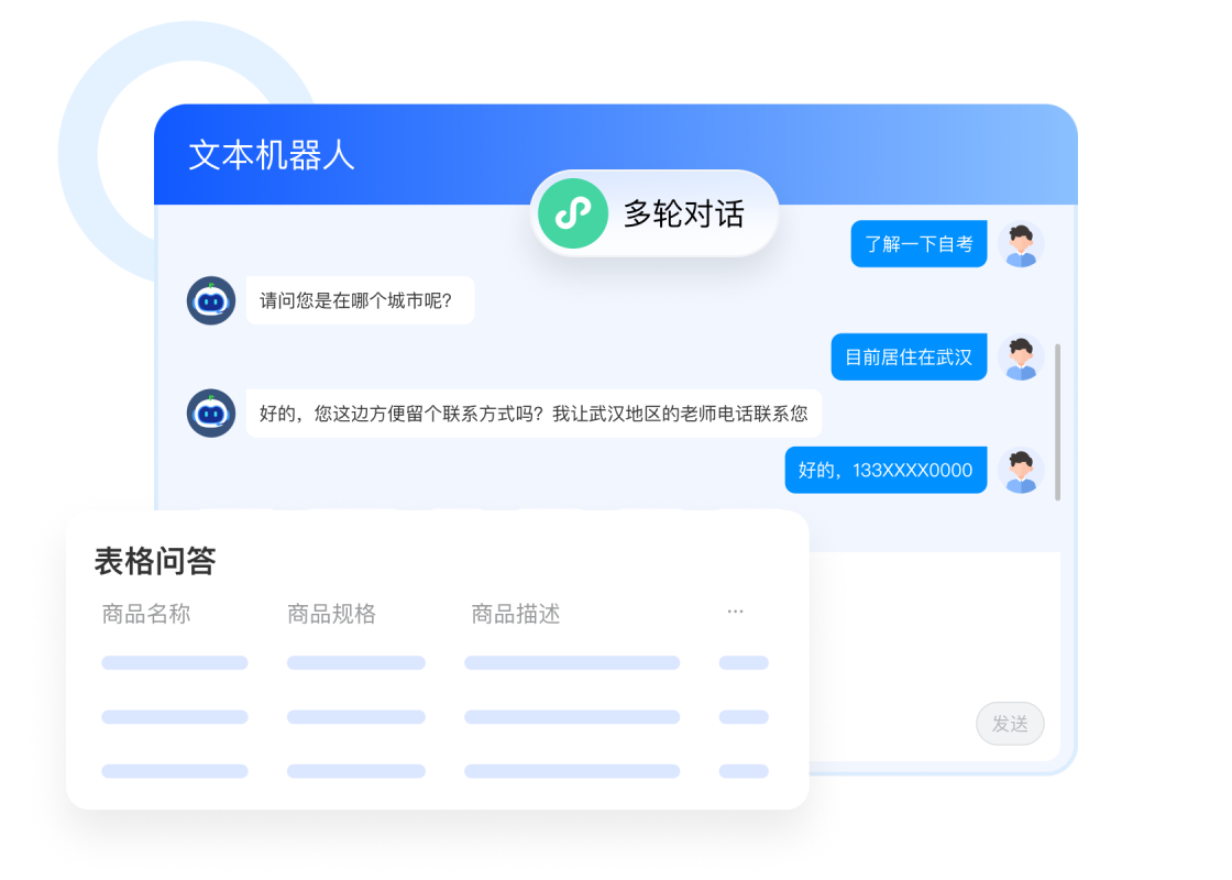 - 主动发问、超时回答、多轮对话、转人工,丰富的服务机制和答案类型让用户得到更好的服务体验